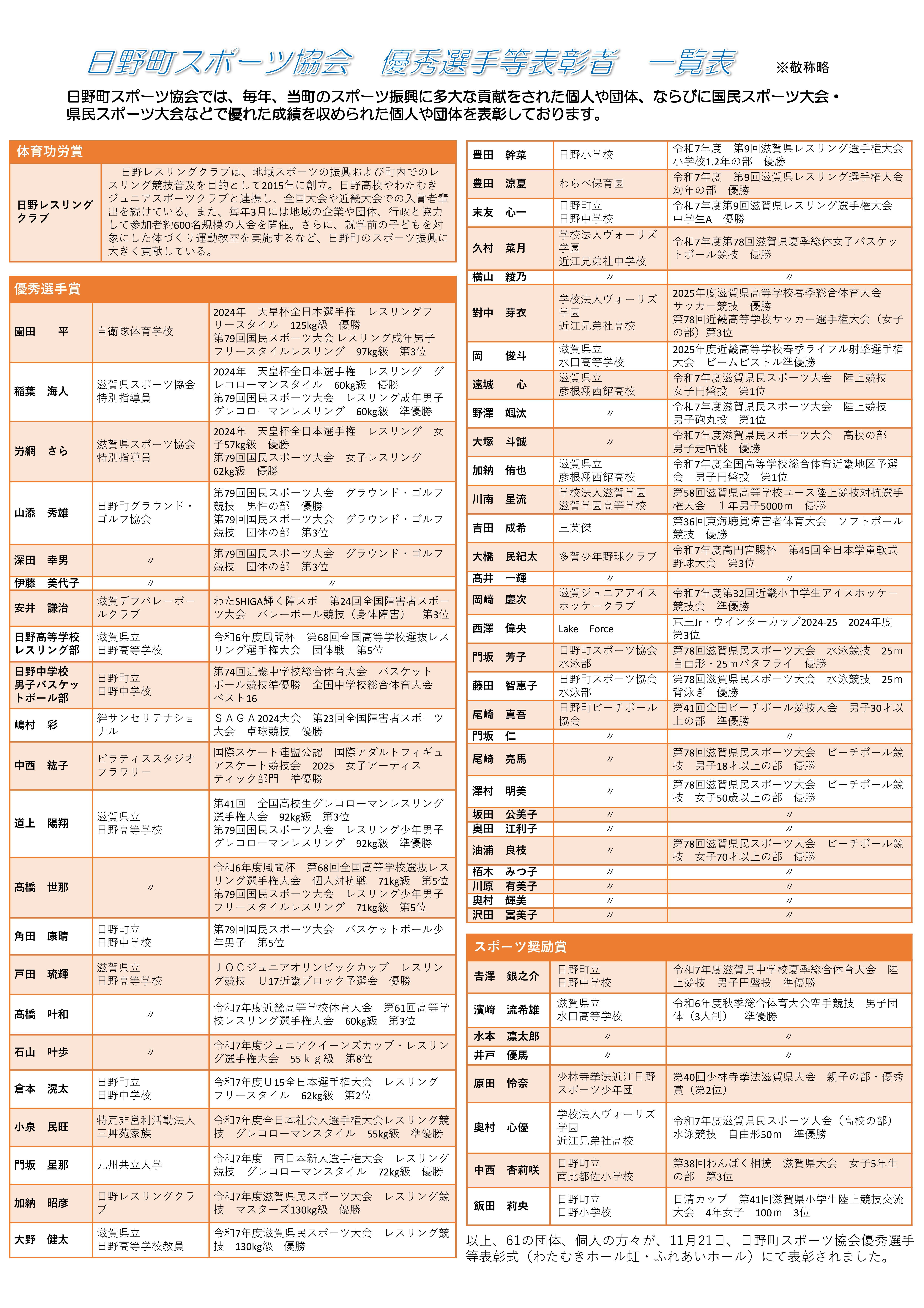 日野町スポーツ協会では、本町のスポーツ振興に大きく貢献された方々や、国民スポーツ大会・県民スポーツ大会等で優れた成績を収められました方々に対し表彰を行っています。今年度は、去る11月21日(金)、わたむきホール虹ふれあいホールにて表彰式を開催いたしました。