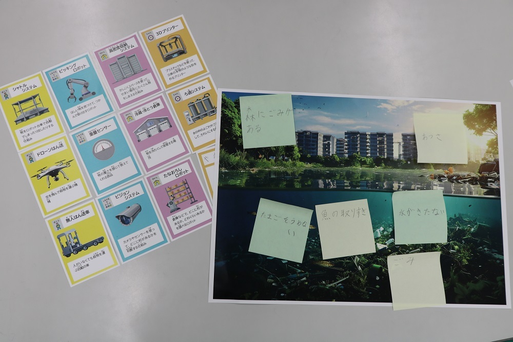 子どもたちは、提示された写真から現在の環境で起こっていることを探し、ワークショップでは、テクノロジーカードを使って、生き物を守るためのアイデアを発表しました。