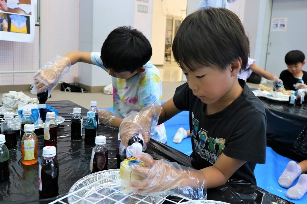 児童たちは、“染物の種類・たたみ方・輪ゴムの止め方・使用する色”などを自分で考えて1人1人の個性が溢れる染物体験を行いました。
