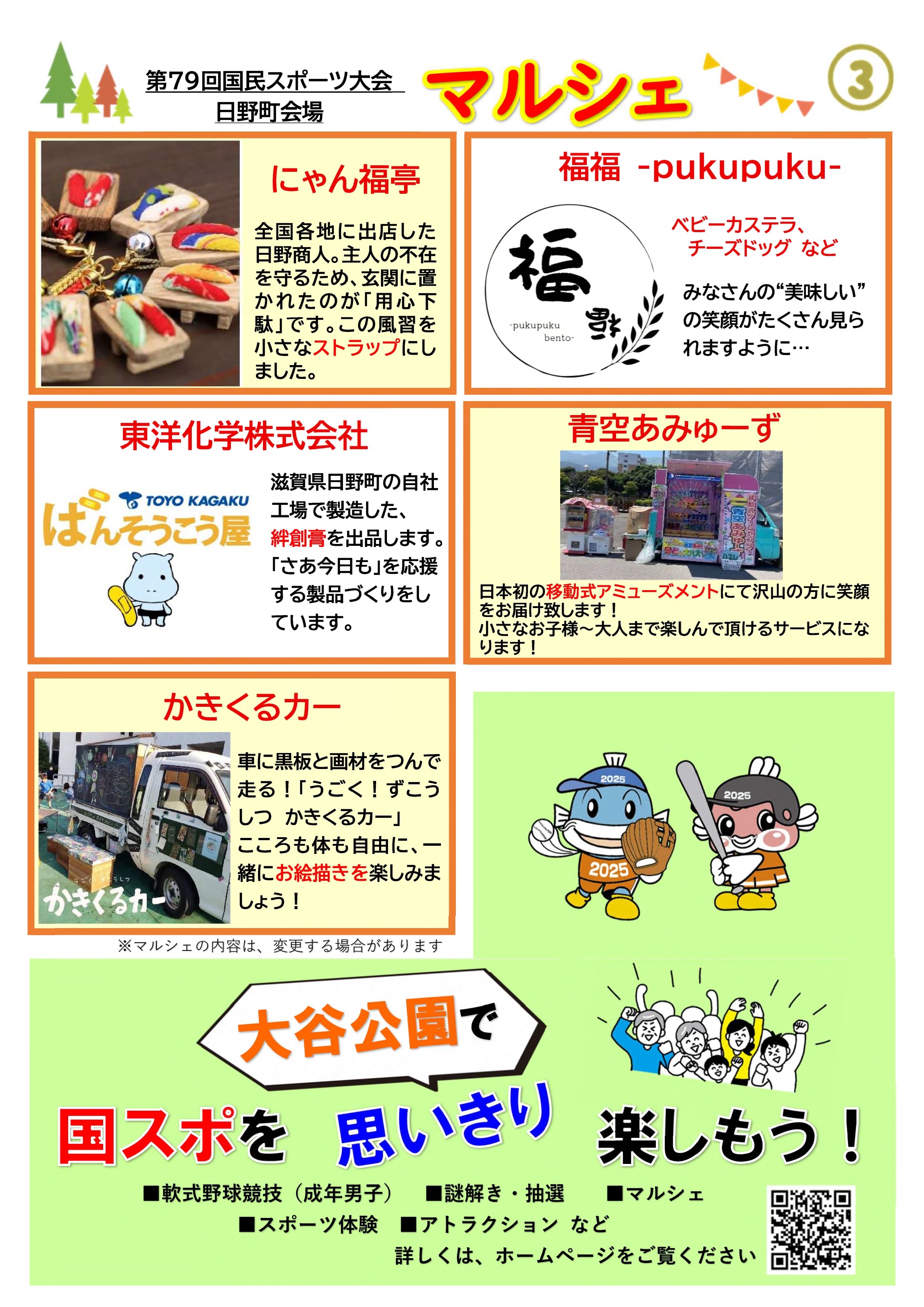 日野町会場では、軟式野球競技(成年男子)、マルシェのほかにも謎解きやスポーツ体験など楽しいイベントを実施します。