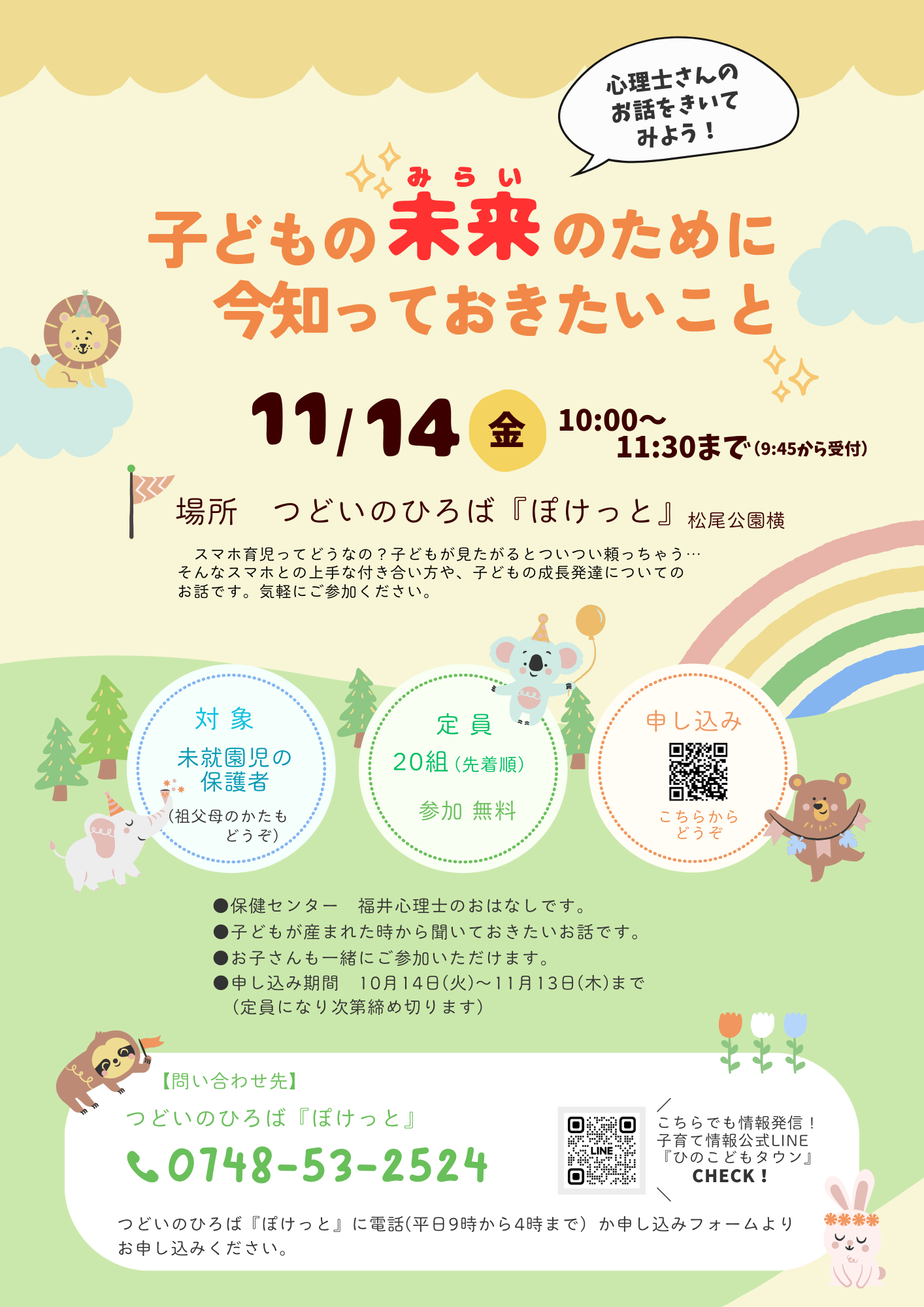 申込み方法:下記の申込みフォーム、チラシの二次元コード、電話(つどいのひろば『ぽけっと』 0748-53-2524 平日9時00分から16時00分)で申込みください。
