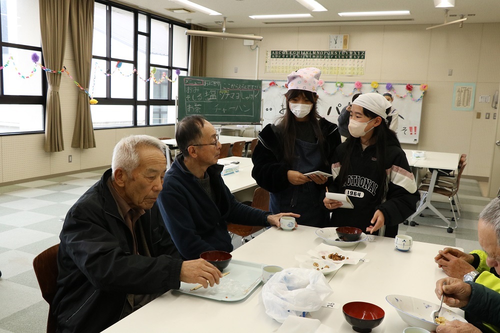 当日は、そのお米を使って児童たちが考えたメニューが提供されました。受付・調理・接客など、当日の運営は児童が担当しました。来場した方には、あたたかいお茶と日野菜チップスをサービスで提供し、注文に応じてみそ汁やおにぎり、日野菜チャーハンをふるまいました。接客を担当した児童は、「食べてもらって、お客さんが笑顔になるところを見たかったので、接客を希望しました」と話してくれました。